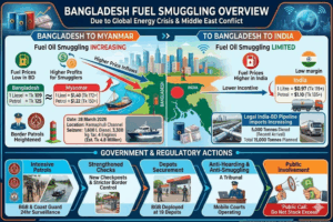 A growing concern is cross-border smuggling. Fuel is flowing out of Bangladesh towards Myanmar, where civil war has driven prices roughly 25% higher (petrol around $1.22 per litre, or about Tk150 at current exchange rates near Tk123 per dollar). On 28 March, the coast guard arrested seven men in Chattogram and seized 1,600 litres of diesel, 3,300 kg of tar, and four engines from a trawler bound for Myanmar. Patrols have been stepped up along the coast and land borders, with rewards offered for information.