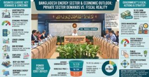 Finance minister Amir Khasru Mahmud Chowdhury, speaking to reporters after Saturday’s meeting at the Prime Minister’s Office in Dhaka, said business leaders highlighted energy shortages as a major constraint on industrial production and overall economic activity. They also urged government support for expanding renewable energy, particularly solar power, to reduce long-term dependence on conventional fuel sources.