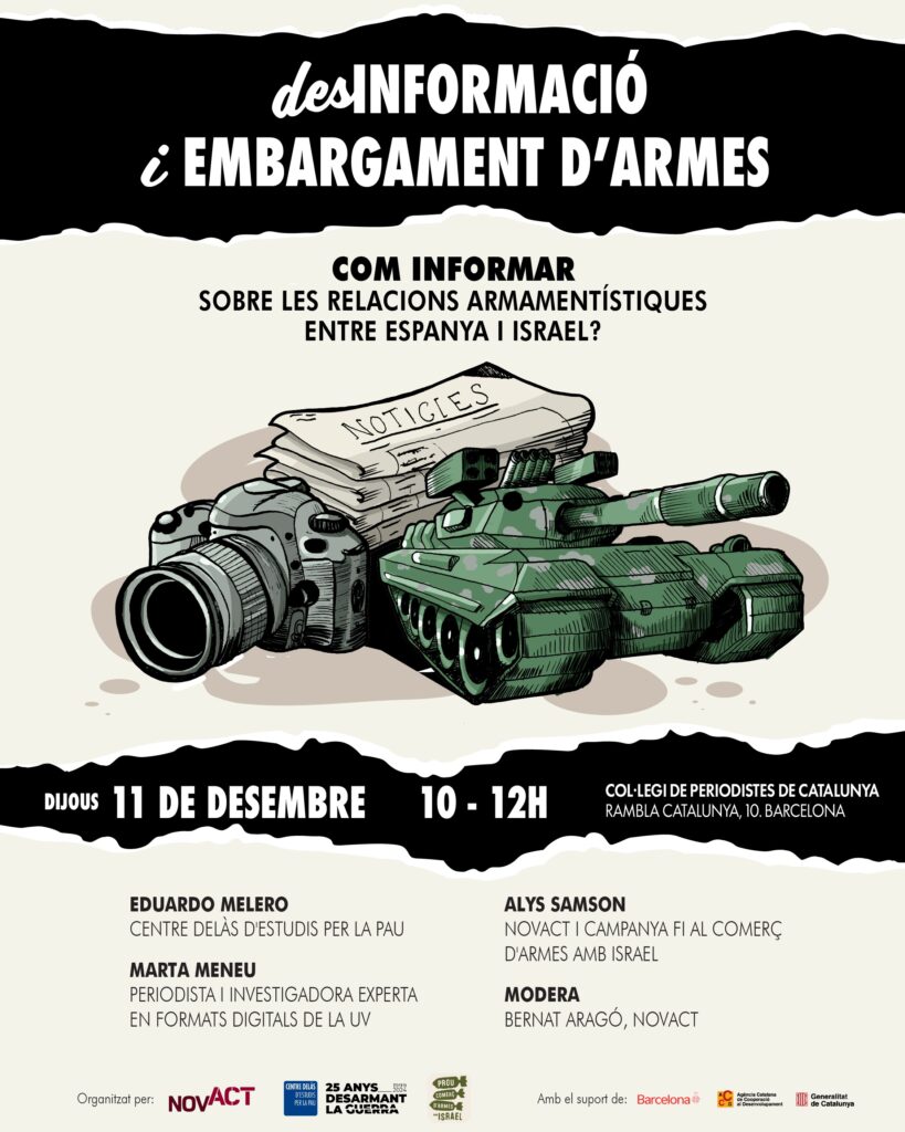 En el marc de la campanya “Prou comerç d’armes amb Israel”, des de l’Institut NOVACT de Noviolència i el Centre Delàs d’Estudis per la Pau organitzem l’acte “Desinformació i embargament d’armes: Com informar sobre les relacions armamentístiques entre Espanya i Israel?”, que tindrà lloc al Col·legi de Periodistes de Catalunya (Rambla Catalunya, 10, Barcelona) el dijous 11 de desembre, de 10 a 12 h.
