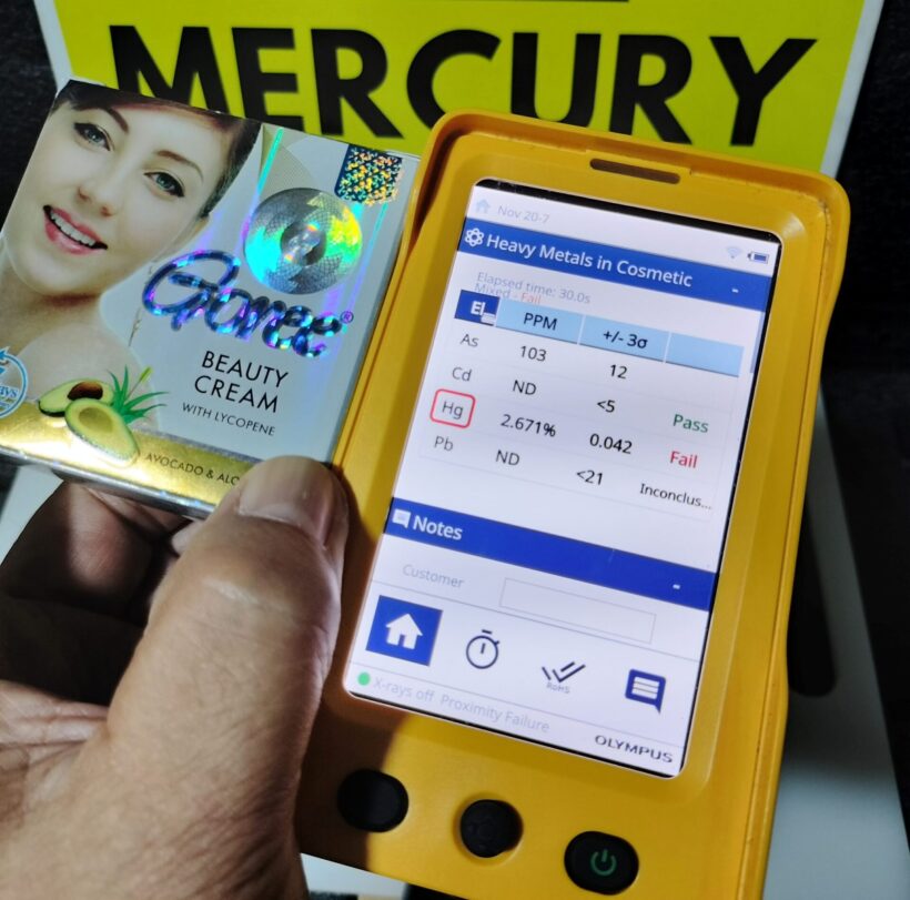 As per XRF screening, this Goree Beauty Cream with Lycopene manufactured in March 2024 is laden with 26,710 parts per million (ppm) of mercury, way above the 1 ppm limit.