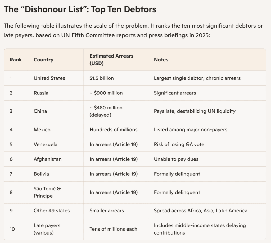 This table shows clearly that the UN’s financial crisis is not caused by the poorest members. It is the largest economies — the United States, Russia, China, and Mexico — that account for the overwhelming majority of arrears. Smaller states are formally listed as “in arrears” under Article 19 of the UN Charter, which means they risk losing their vote in the General Assembly.